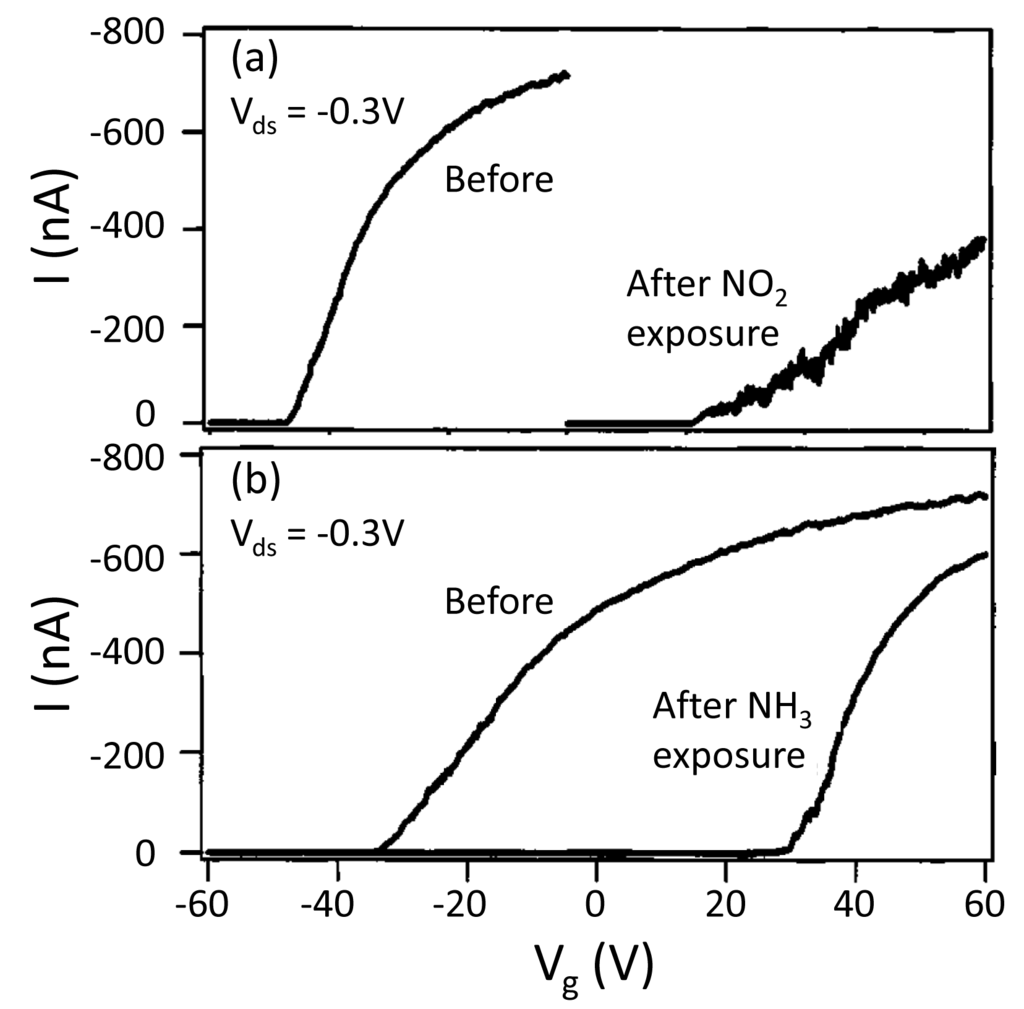 In2O3 is another popular material for gas sensors and several works are about In2O3 nanowire FET gas sensors [63,64,88–90]. Zhou et al. reported the first work on individual In2O3 nanowire transistors as room temperature gas sensors [63]. Upon exposure to 100 ppm NO2 in Ar at a bias of Minus0.3V, the shape of the transfer characteristic curve changed a lot and the threshold voltage shifted from Minus48 to 20 V, as shown in Figure 8a. It means that, due to NO2, the free carrier concentration of the nanowires decrease dramatically. A similar behavior can be observed for NH3 in Ar, as shown in Figure 8b. Note that the transfer characteristics are very different for NO2 and NH3 gases. By carefully selecting the working gate voltage, sensitivity as high as 105 is reached for NH3 detection.