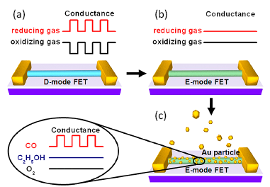 In order to realized selectivity, Liao et al. designed a nanowire transistor that worked at the enhancement mode with the help of decorated nanoparticles [64]. The basic mechanism is very similar to the device shown in Figure 4. As shown in Figure 9a, in a normal n-type oxide nanowire gas sensor, which works on electron transfer between the nanowire and the gas molecules adsorbed on the surface, can response to both reducing and oxidizing molecules, with an increase and decrease of conductance, respectively. If the nanowire channel is tuned to enhancement mode, because the channel is depleted, it cannot detect oxidizing gases. If the channel is depleted much deeper, even reducing gases cannot be detected. Therefore, the device has no response to both oxidizing and reducing gases, as shown in Figure 9b. However, the surface of the nanowire can be activated by decorating selected catalytic metal nanoparticles, such as Au, Pt and Ag, to realize sensitivity and selectivity to CO, H2 and ethanol, respectively. An illustration for the Au-decorated case is shown in Figure 9c. An experimental demonstration was performed on gas sensors based on Mg-doped In2O3 nanowires. In addition to the efficient response to one particular gas, the sensors also exhibited high sensitivity, low power consumption and fast response. The devices can work at room temperature and detect to sub ppm level for reducing gases such as CO.
