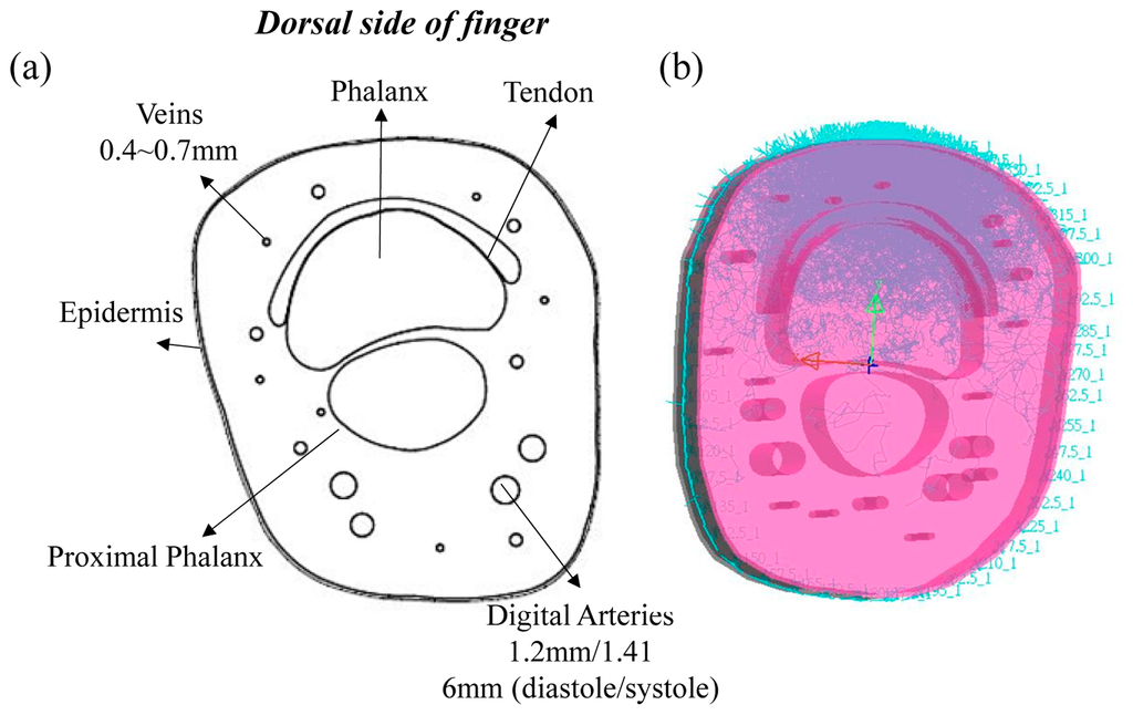The structure of the finger base is shown in Figure 1a [23,24], and it includes the tissue components of the epidermis, dermis, phalanx, proximal phalanx, digital arteries and veins. Based on the structure of the finger base, two different finger-base models were built by AutoCAD. Here, the thickness of epidermis is about 0.2 mm, and the thickness of the finger base is about 20 mm. A pair of digital arteries were set under the proximal phalanx, and several veins were placed around the phalanx. The diameter of the diastole digital arteries is about 1.2 mm, and that of the systole digital arteries is about 1.416 mm. The diameter of several veins is about 0.4∼0.7 mm. The sizes of two finger-base models are 40 mm × 18.4 mm × 22.4 mm and 40 mm × 22.3 mm × 25.8 mm, respectively. Certainly, the tissue shape, the size and the placement of tissues in the finger base are also different. Figure 1b shows the randomly selected optical human tissue simulation result. Additionally, each finger model contains two modes (the diastolic and systolic modes). The difference between the diastolic and systolic modes of each finger model is only the diameter of the digital arteries, and the simulation results of the diastolic and systolic modes were used to calculate the parameter R and the P-I ratio.