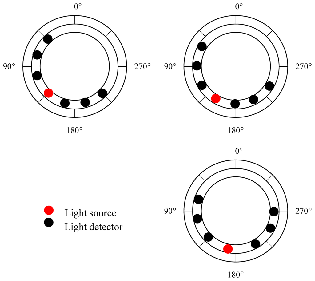 In order to validate the simulation results, a wearable and wireless ring-type pulse oximeter was designed and implemented in this study. The basic block diagram of the ring-type pulse oximeter is shown in Figure 2. It mainly contains an optical probe and a wireless signal acquisition module. Here, the optical probe was designed to provide the light source and receive the penetrated light that passes through the tissue. The surface-mounted device (SMD) light-emitting diode (LED; SMT660/940, epitex, Japan) and silicon-pin photodiode (PD; PD15-22C/TR8, EVERLIGHT, Taiwan) were embedded in the optical probe and used as the light source and the light detector. The LED used can provide the 660-nm and 940-nm light sources. In order to investigate the efficiency of different ring-type pulse oximeter designs, three types of optical probes were assembled. Additionally, the placements of the light source and the light detectors for the three optical probes are shown in Figure 3.