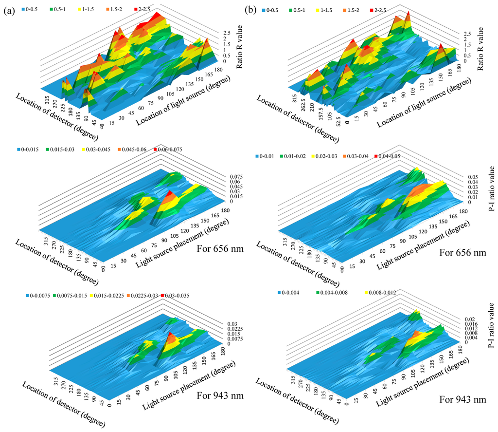From the simulation results, when the light source was placed at 0°–30°, the P-I ratio was very small and the value of the R ratio was unstable. This is due to the light source being placed at the opposite site of the digital arteries and the phalanx. The phalanx is the major opaque material obstructing most of the penetrated light. When the light source was placed at 45°–120°, the P-I ratio can be improved and was larger than that of placing the light source at 0°–30°. However, the light source in these design is close to the phalanx. Much of the penetrated light is easily affected by the shape, size and location of the phalanx. Therefore, for different finger-base models, the value of the P-I ratio is easily affected by the structural differences of the finger base.