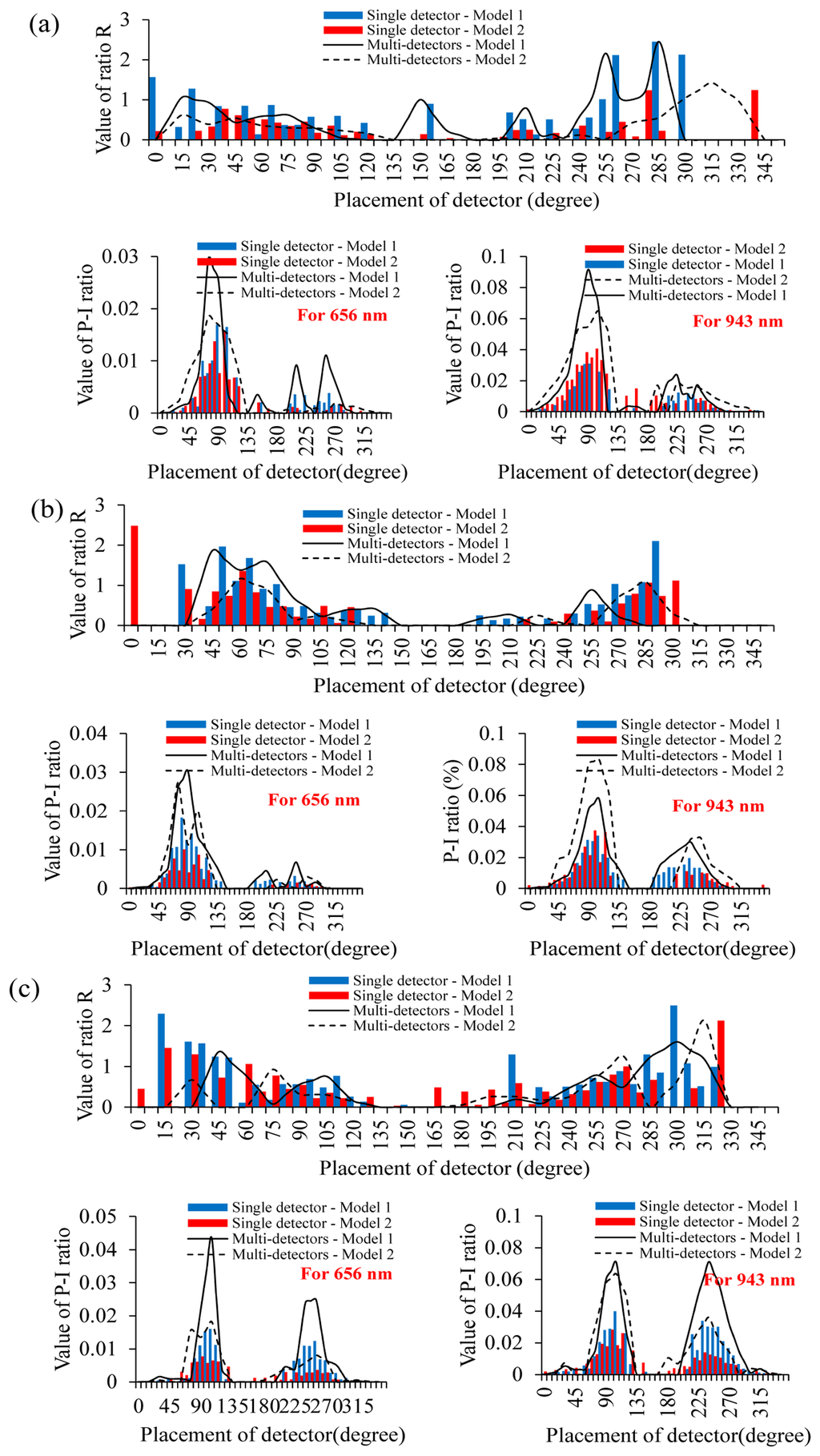 Next, the efficiency of different ring-type pulse oximeter designs with a multi-detector was investigated. Here, the detector array consisting of three light detectors was used as the multi-detector. From the simulation results of the ring-type pulse oximeter with a single detector, these designs for placing the light source at 135°–165° can provide better P-I ratio values and reasonable ratio R values. Therefore, for this simulation, the light source was also placed at 135°–165°. Figure 5 is the comparison of the simulation results of P-I ratio values and ratio R values for a single detector and a multi-detector when the light source was placed at 135°, 150° and 165°, respectively. Compared with the result of using the single detector, the variation of ratio R values corresponding to different detector locations for a multi-detector become more stable. Therefore, for a multi-detector, the influence of selecting the detector location on the performance of measuring SPO2 becomes small. Moreover, the P-I ratio values for these designs (the light source at 135°, the multi-detector at 75°–105°; the light source at 150°, the multi-detector at 90°–105°; the light source at 165°, the multi-detector at 90°–105° or at 240°–255°) can be effectively enhanced.