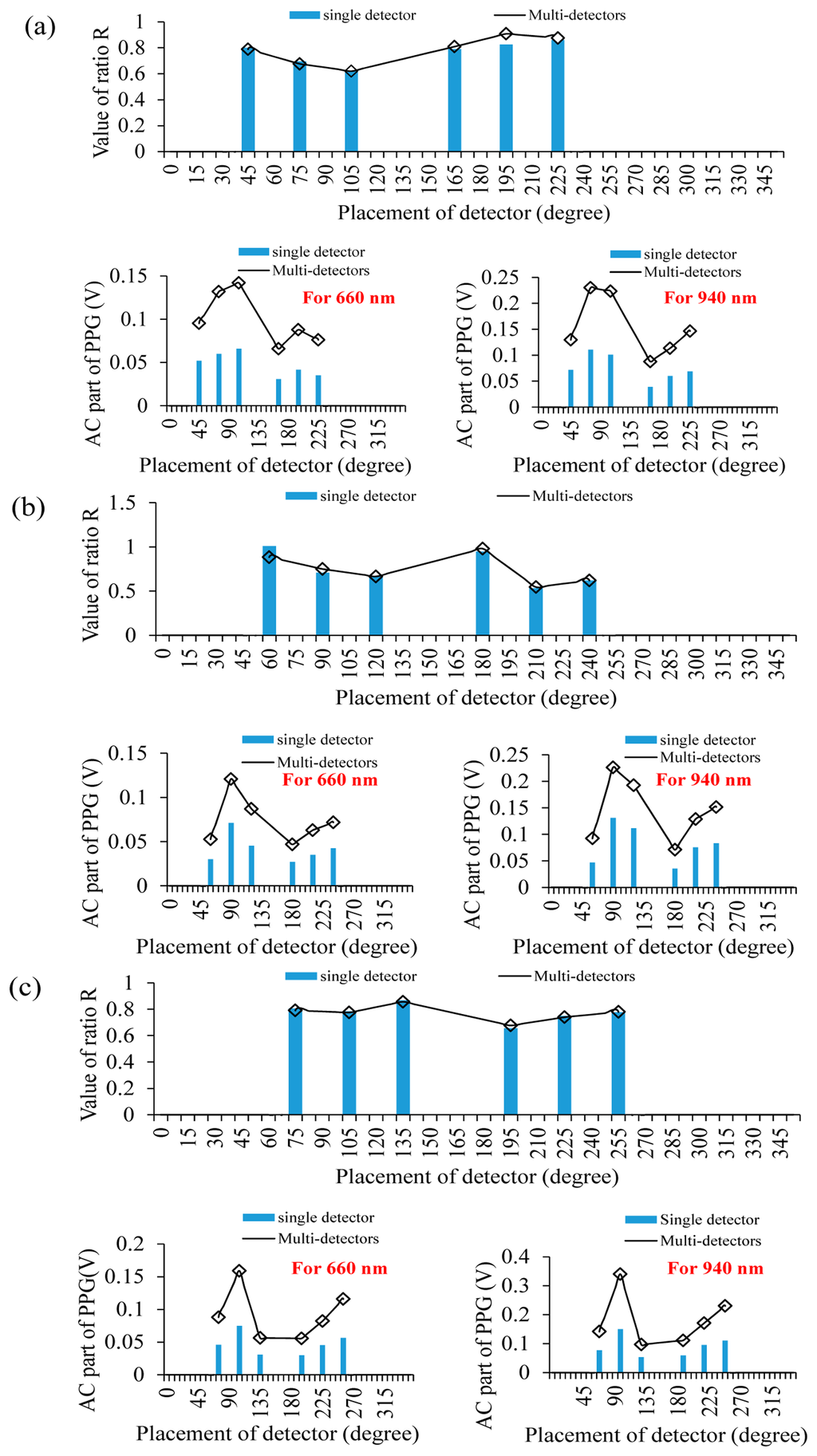 When using the multi-detector, when the light source was placed at 135°, placing the multi-detector at 75° can provide the larger AC part of the PPG than that of using a single detector, and the ratio R value is also reasonable. When the light source and the multi-detector were placed at 150° and 90°, respectively, and the light source and the multi-detector were placed at 165° and 105°, respectively, these designs can also provide the larger AC part of the PPG than that using the single detector. Therefore, using the multi-detector can enhance the efficiency of collecting the PPG signal and reduce the influence of selecting the detector location.