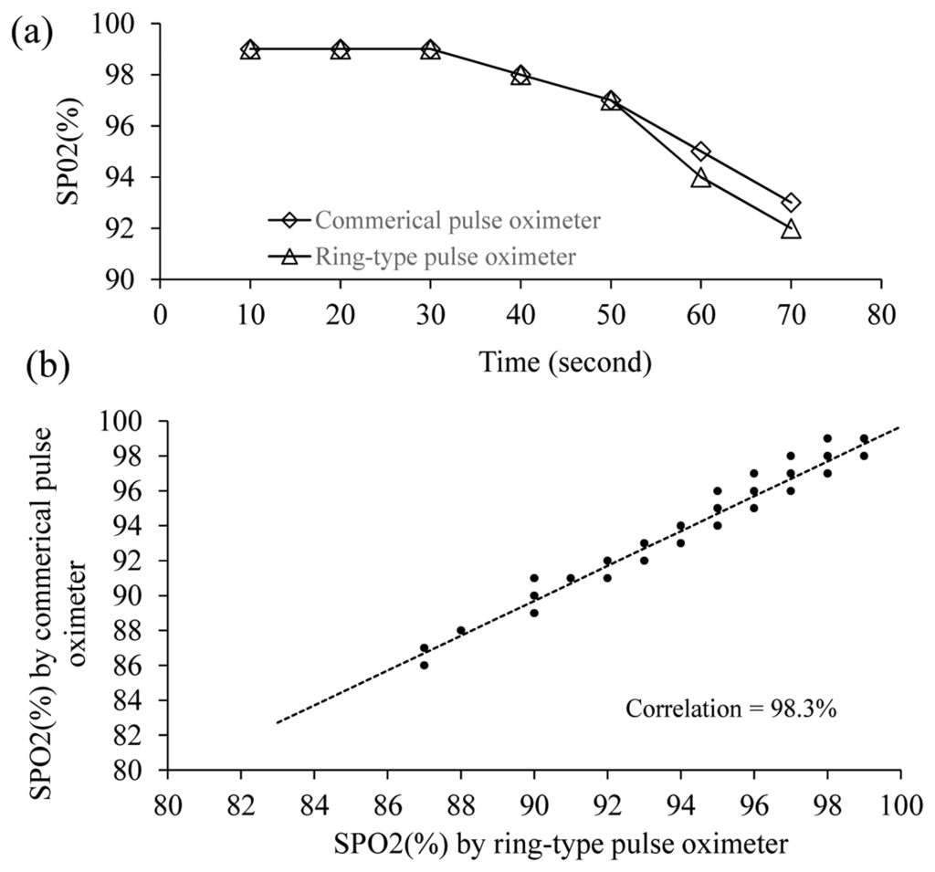 Next, the performance of the proposed ring-type pulse oximeter with the multi-detector (the light source is at 165° and the detector is at 105°) for measuring SPO2 was compared with that of a commercial fingertip-type pulse oximeter (DB11, DELBIO, Taiwan). A total of 10 healthy participants joined this experiment. The participant was instructed to equip themselves with the proposed ring-type pulse oximeter and the commercial fingertip-type pulse oximeter simultaneously. Next, the participant was instructed to hold his/her breath for about 70 s. Figure 7 shows one of the experimental results for the change of SPO2 measured by different pulse oximeters. It shows that both of the SPO2 values measured by different pulse oximeters dropped slowly from 99% to 97% during the first 50 s, and dropped drastically from 97% to 92% after 50 s. The correlation between the SPO2 values measured by the proposed ring-type pulse oximeter and the commercial fingertip-type pulse oximeter is high (98.26%). Therefore, the proposed ring-type pulse oximeter with the multi-detector can provide similar performance to the commercial fingertip-type pulse oximeter.