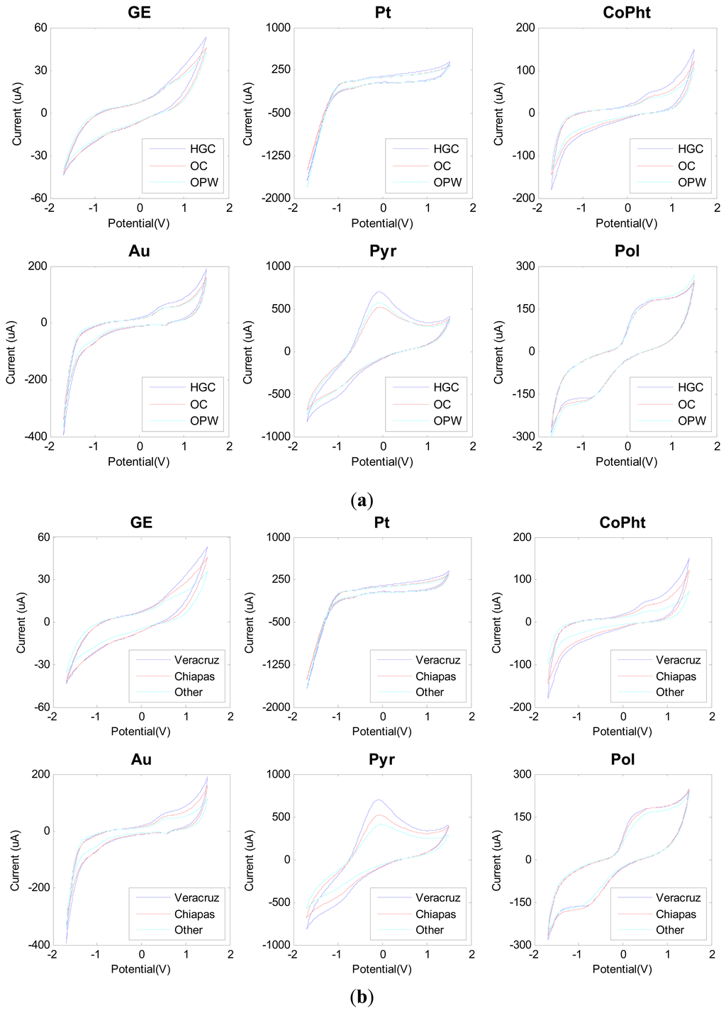 Similarly, the reader is referred to the information presented in the supplementary material to visualize a blank signal of each sensor. Different Figures S1–S6 show the significance of the voltammograms in front of the blank. It may be noted that the measured voltammograms exhibit variations not only in current intensities, but also in shape.
