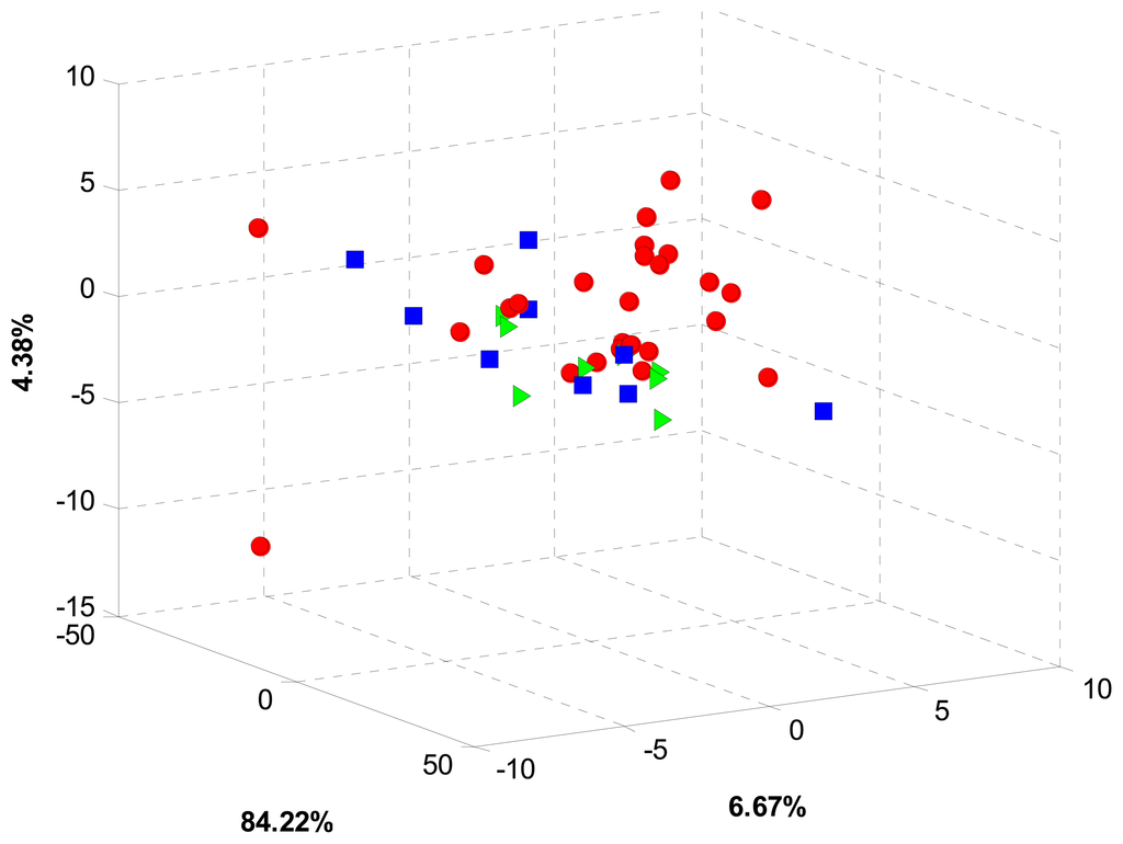 Given the clear response variability of sensors, the first processing stage was done using PCA in order to find some sort of pattern in sensor data. For this stage, a preprocessing stage covering blank correction, centering and standardization was applied to the whole voltammetric data. Multidimensional information coming from the sensor array was then arranged into a matricized array of dimension 42 × 4272 (samples × stacked measurements from the six sensors). Considering the differences in geographical origin and growing conditions, a grouping trend, according to some of these two features, was expected. However, even though the cumulated total variance was 95.27%, PCA analysis did not show any significant pattern in data. Moreover, a strong scattering trend was observed for all the coffee samples as can be observed in Figure 3.