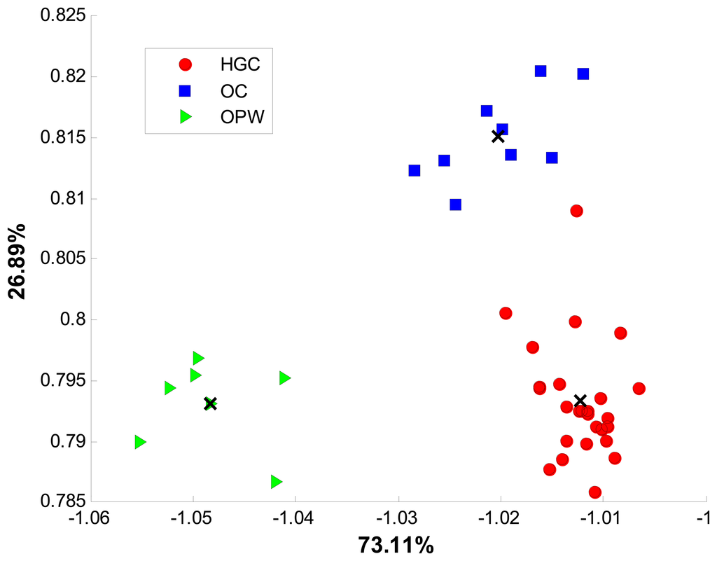 According to crop altitude, 35 samples of the total set were identified as High Grown Coffee (HGC) while the last seven remaining samples were Prime Washed (PW) coffees. In relation to the cultivation practices, all PW samples and nine HGC samples were from organic crops. Therefore, to distinguish these samples, they were named as Organic Prime Washed coffee (OPW) and Organic Coffee (OC) respectively. In Table 1, characteristics for all samples are summarized. HGC refers to high grown coffee, OC depicts high grown coffee from organic crops and OPW represents organic coffee crops cultivated at lower altitudes.