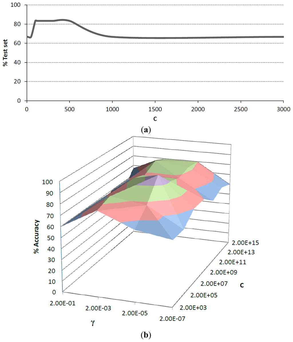 As mentioned earlier, SVM discrimination was based on linear and radial basis function (RBF) kernels. Before the validation stage, the parameters in both kernels were optimized. For linear kernel, the cost parameter c was evaluated in the range of 0–3000. After training, results from test set showed a maximum accuracy of 83.3% in the range of 100–500. Values outside this range exhibited strong overfitting trend, which can be observed in Figure 5a. For RBF kernel the cost parameter c and the kernel coefficient γ, were studied in the range of 2 × 103 to 2 × 1015 for c and 2 × 10−1 to 2 × 10−7 for γ. It was observed that γ values in the upper and lower limits of this range resulted in overfitting, while middle values tend to be more accurate. Figure 5b shows the surface obtained for the different c and γ values. A maximum percentage of accuracy for RBF kernel was observed with c equal to 2 × 107 and γ equal to 2 × 10−5, which was chosen over the linear kernel.