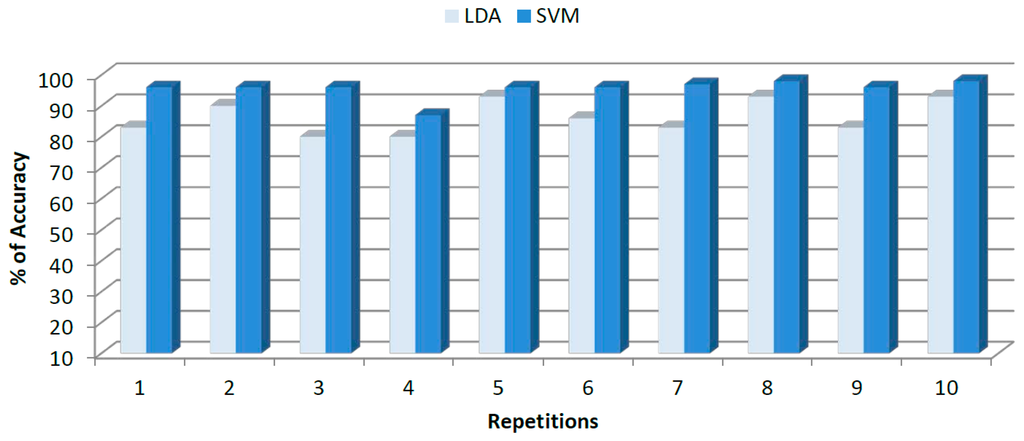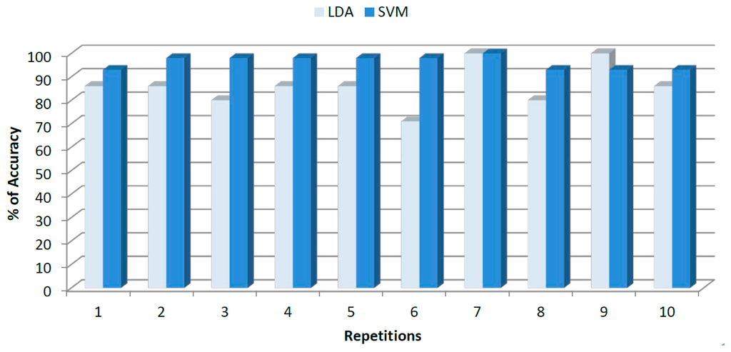 Average accuracy achieved by LDA was 87.5% ± 7.79%, while SVM showed a superior performance of 97.5% ± 3.22%. The higher deviation of ±7.79% for LDA can be noted on the inconsistent trend showed by Figure 8. Sensitivities and specificities for each class along with the overall performance are shown in Table 3.