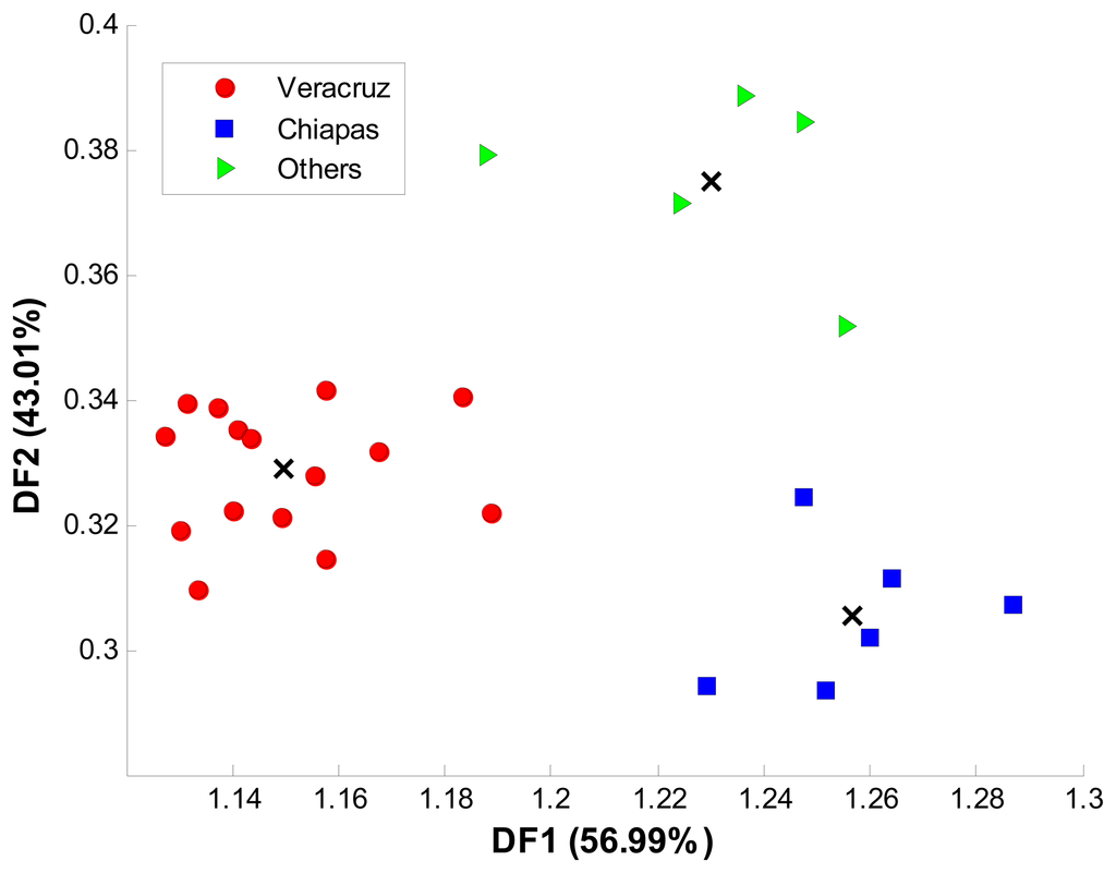 According to the International Coffee Organization (ICO), in the 2012 productive year, Mexico occupied the eighth position among the world coffee producers [1]. Mexican production is supported by approximately 15 regions of coffee growing, distinguished by geographical location, local microclimate and the particular cultivation procedures followed in each zone. To ensure coffee quality for final consumers, the Mexican government established different regulations for evaluation in accordance to international standards. In this sense, and given the importance of geographical location, Veracruz and Chiapas own a protected designation of origin (DO) [2,3]. Current regulation classifies as high grown coffee (HGC) to crops growing from 900 to 1200 m above sea level (m.a.s.l.) and as prime washed coffee (PW) to crops growing from 600 to 800 m.a.s.l. [4].