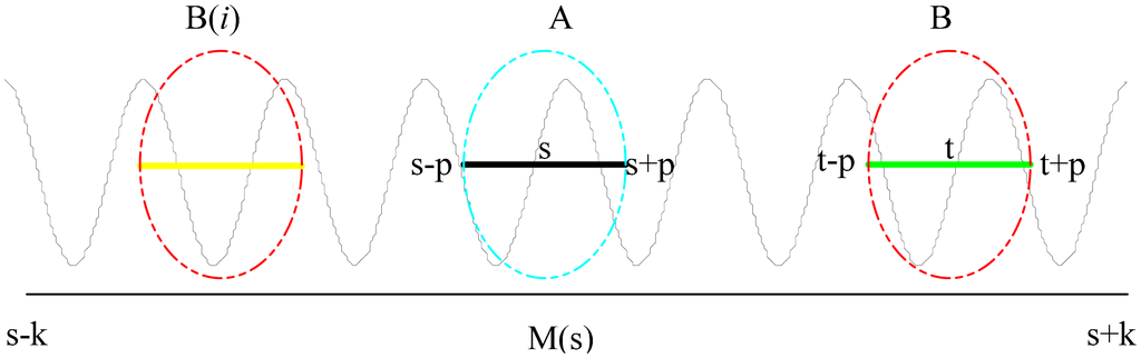 Parameters are examined for rolling bearing signal denoising from NL-means in the 2D image processing methods. Assume that the patch, A, is the goal to restore, which focuses on s as the center. The three key parameters of fast NL-Means are the width of the patch size P (LΔ = [−P,P]), the size of the search domain K (M(s) = [−K, K]) and the bandwidth λ. The similar patch, B, has the same length as the goal patch, A. Similar degrees are measured by ω (s,t). All of the similar patches, B, are obtained from the estimated value of A. Figure 1 shows the nonlocal average algorithm parameters.