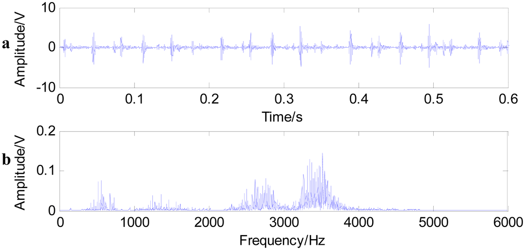 In this paper, we conduct fast NL-Means and the envelop spectrum process on the rolling bearing signals with the inner race defect and outer race defect separately. Figure 9 shows the time waveform of the original signals with an inner race defect (a) and the spectrum of the original signals (b). The characteristics of impact are not obvious under the condition that the bearing characteristic information is submerged by the noises in Figure 9a. The energy mainly concentrates in the high frequency of the resonance wave in the spectrum. Firstly, the noise variance is estimated, then fast-NL-Means is conducted with the original signals. Figure 10a shows the time waveform of filtered signals. We note that the filtered signals have obvious impact characteristics. Fast NL-Means retains the high amplitude area and reduces the noise interferences better. The analysis of the envelope shows some obvious characteristic frequencies of this rolling bearing. In Figure 10b, the rotating speed frequency fa = 29 Hz, and the inner ring failure frequency fi = 158 Hz are clear, and we also find the frequency multiplications 2fi and 3fi. At the same time, the failure frequency amplitude is obvious; thus, we can diagnose that a bearing inner ring fault happened.