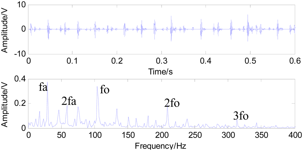 Figure 11 shows the time waveform of the original signals with an outer race defect (a) and the spectrum of the original signals (b). From Figure 11a, it can be seen that the time domain waveform is desultory and that a burr is prominent. However, the signal energy concentrates on the high order vibration mode, and low frequency characteristics of signals are drowned out by the noises in Figure 11b. Figure 12 shows the time waveform of filtered signals with an outer race defect by using fast NL-Means (a) and the envelope spectrum of the filtered signals (b). From Figure 12a, we can see that high amplitude areas are better preserved, and the noise reduction is obvious. Through applying the proposed approach to the original signals, the outer race defect can be found, then envelop spectrum analysis is performed. From Figure 12b, the rotating speed frequency fa = 29 Hz and the outer ring failure frequency fo = 105 Hz, the frequency multiplication 2 fo and 3 fo are clear. Meanwhile, the failure frequency amplitudes are obvious. Thus, we can diagnose that a bearing outer ring fault happened.