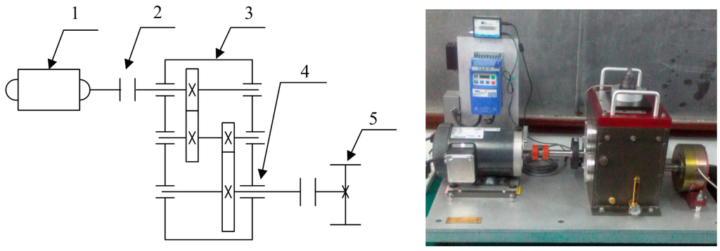 In order to further verify the effectiveness of the proposed method in this paper, we conduct the experiment on the Drivetrain Diagnostics Simulator, which is provided by SQi in the USA. The experimental device is shown in Figure 13. The drivetrain consists of a 2-stage planetary gearbox, a 2-stage parallel shaft gearbox with rolling or sleeve bearings, a bearing loader and a programmable magnetic brake. Here, normal gear and a defect bearing with an outer ring pitting fault are used for testing. The sampling frequency is 2000 Hz, and the rotating speed frequency is 57 Hz. Because of the characteristics of the three-phase asynchronous motor, the actual rotating speed frequency fluctuates slightly. In the test, we measured the rotating speed frequency of the input shaft f1 = 57 Hz through the tachometer and the actual rotating speed frequency of the intermediate shaft f2 = 15.6 Hz and the output shaft f3 = 6.2 Hz. The defect bearing is the FAFNIR deep groove ball bearing ER-16k. According to the bearing parameters and the gearbox transmission rule, the characteristic frequency of ER-16k with an outer ring fault f0 = 3.572, f1 = 188.2 Hz.