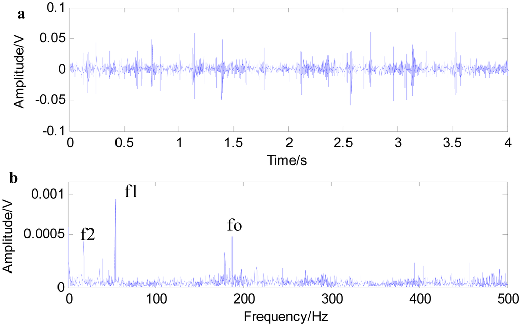 Figure 14 shows the time waveform of the original signals with an outer race defect (a) and the envelop spectrum of the original signals (b). Due to the noise interferences, the original signal waveform is desultory, and the impact characteristic peaks are not obvious. The characteristic frequencies cannot be found in the envelope spectrum. Figure 15 shows the time waveform of filtered signals with an outer race defect by using fast NL-Means (a) and the envelope spectrum of the filtered signals (b). The high amplitude areas are better preserved, and the impact characteristic peaks are obvious, because the noises are suppressed to a certain extent. On the envelope spectrum, we find the rotating speed frequency of input shaft f1 and intermediate shaft f2. We can also find the outer ring failure characteristic frequency fo. The characteristic frequency amplitudes are obvious and have no interference frequency components. For this reason, we can diagnose that the bearing outer ring fault happened.