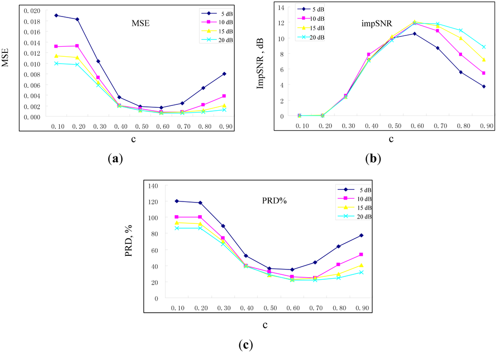 Figure 3 shows different evaluation indexes when fast NL-Means is adapted to the different noises. Here, the c is gradually increased from 0.10 to 0.90, and the noise decibel is increased from 5 dB to 20 dB at the same time. From Figure 3, the value of c has an optimal solution. In the three evaluation indexes, when λ = 0.6 σ, a lower MSE and PRD% can be obtained; meanwhile, impSNR obtains the maximum value. Therefore, the parameters of fast NL-Means for these simulated fault signals of rolling bearings are determined as P = 100, K = 4000 and λ = 0.6 σ.