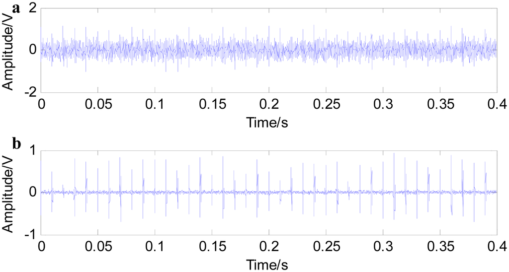 Nowadays, the rolling bearing has been widely used in the applications of modern industrial society, and its working conditions are of vital importance. Rolling bearing faults appear with a great incidence, due to its complexity and poor working conditions, and bearing signals are usually drowned by noises in practice, which make fault diagnosis difficult [1,2]. Therefore, it becomes an important point to reduce the interferences of noise more effectively, which has attracted great attention from a great many scholars.