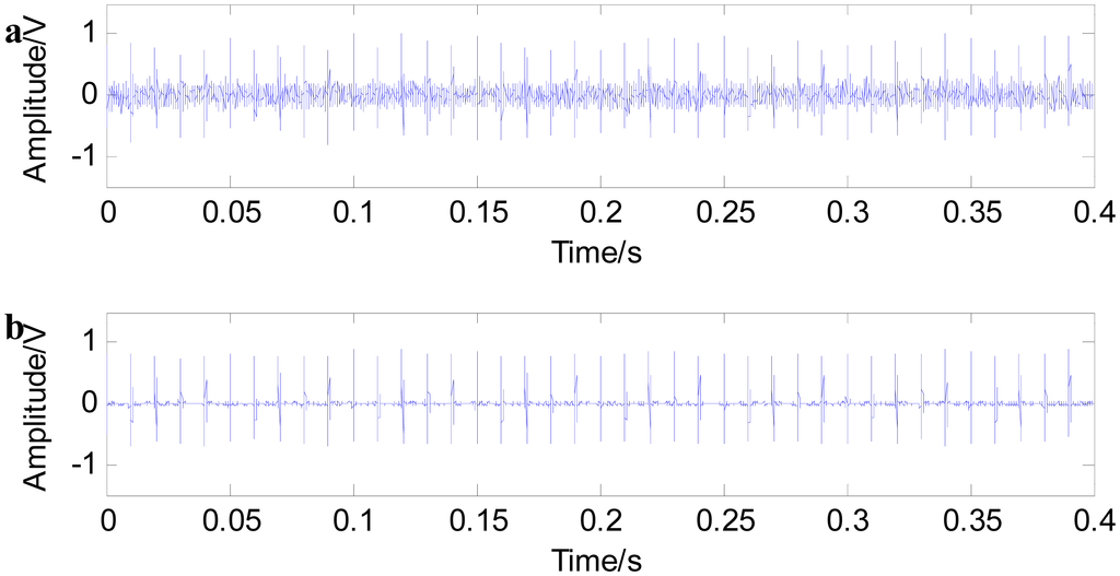 Figure 4 shows the noise reduction effect of fast NL-Means. The pulse signals are submerged in noises, and the signal peaks are not obvious when adding a signal-to-noise ratio of 2 dB (A) Gaussian white noise (in this paper, it is assumed that there is only one noise type, Gaussian white noise). It is difficult to judge fault impact characteristic information only from the time domain waveform. Figure 4a,b shows the filtered signals with fast NL-Means. From Figure 4, it is noted that with the help of fast NL-Means, the fault characteristic peaks embody the noise signals. Figure 5 shows that a better result can be obtained when reducing the strength of the noises.