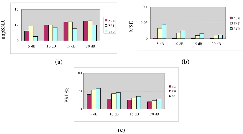 In order to further the instructions, Figure 6 shows all three evaluation indexes calculated across the simulated fault signals of the rolling bearing as a function of SNR. The figure also shows the results for the other two algorithms: one is a wavelet soft thresholding method (WST), while the other is a singular value decomposition denoising method (SVD). From Figure 6, NL-Means achieves lower MSE and PRD% than the other methods, when the SNRs growth NL-Means get closer to the original signal.