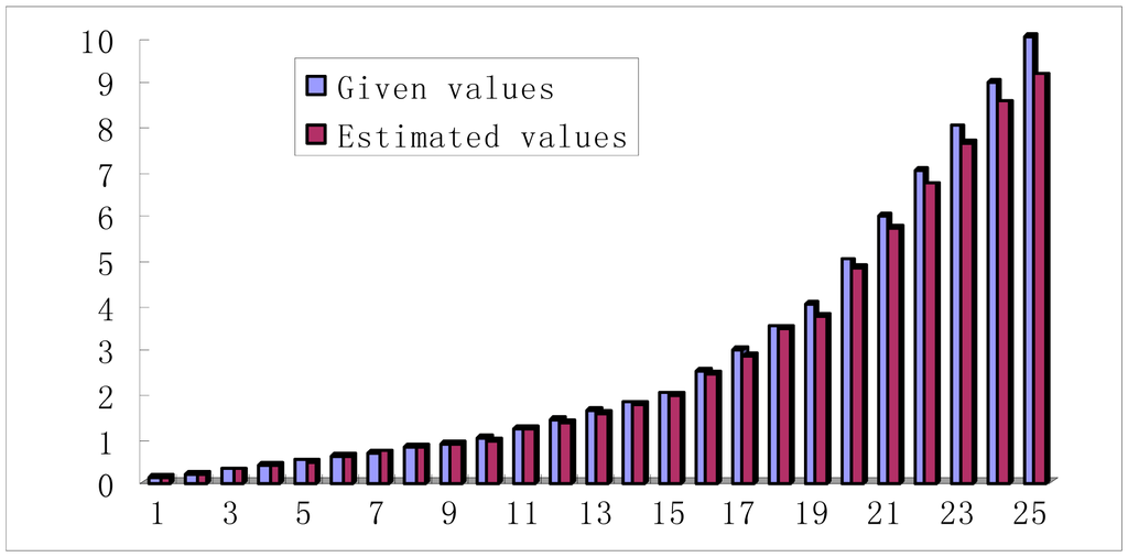 For the simulation signals, the noise variance is given, which can be estimated in practice. Many scholars have conducted a lot of research on noise estimation. However, most of the research is based on the wavelet domain. A simple noise variance estimation method in this paper is put forward to reduce the computing time. Gaussian noise is subject to normal distribution N(0, σ), and it can be seen as combined random variables, which are made up by a series of small random variable in some cases. From Figure 2b, it can be seen that there are many flat areas on bearing signals, and the variances can be directly regarded as noise variances for those flat areas. Therefore, bearing signals can be cut into many small pieces with the same size, and all of the variance of the small pieces is calculated and the smallest values averaged (the number should not be less than three and more than 1% of the total). For the simulated rolling bearing signals, this method is used to for noise estimation. The experimental results are given in Figure 7. This method caused a very small percentage error, and the estimated values are almost equal to the given values.