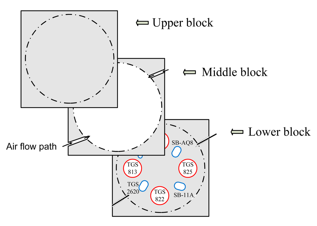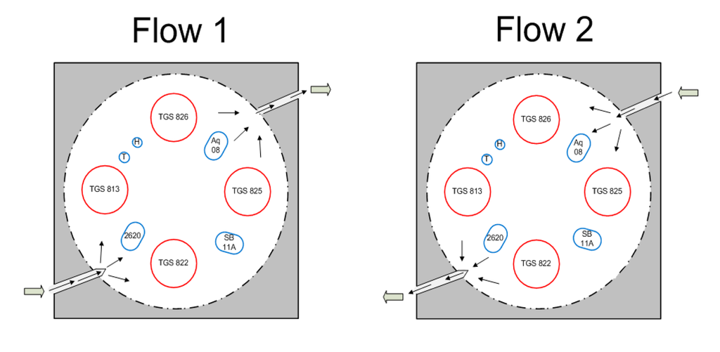 The MOS sensors were positioned in a circular fashion inside the chamber. Two MOS sensors were positioned near the inlet and outlet holes through which the sample gas enters and leaves the chamber. Due to the potential fluid dynamic effects near the entrance and exit of the air samples, it was important to determine if these MOS sensors observed any entry/exit effects in their responses to the samples. The following test procedure addressed this question.