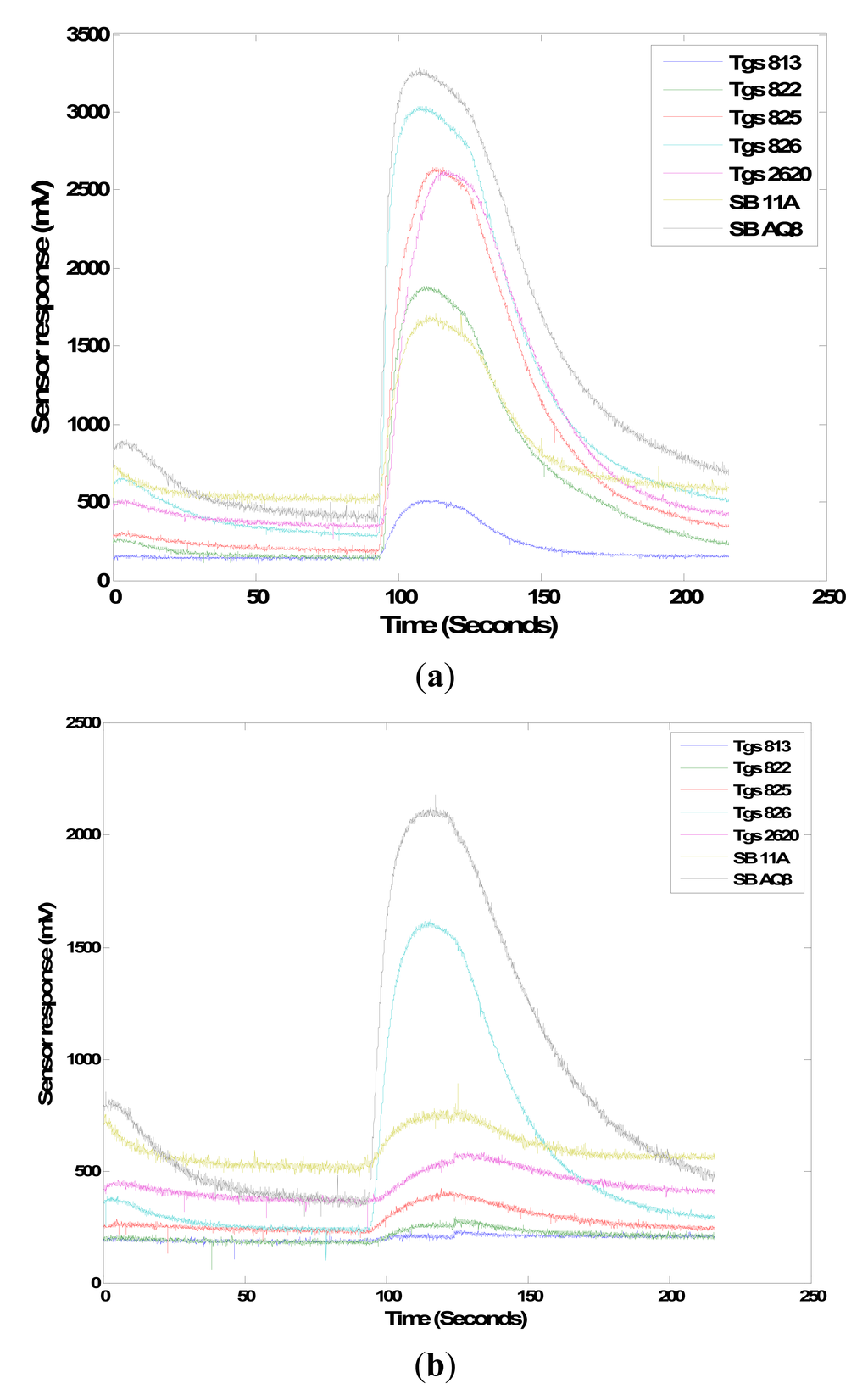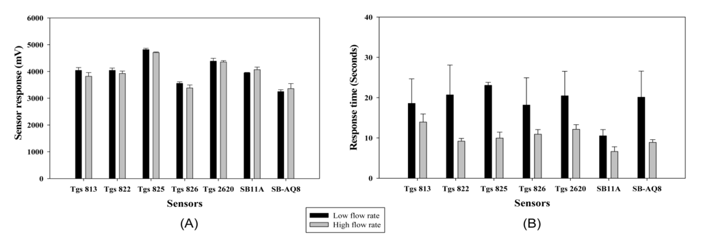 Each 0.1 mL of ethanol solution (100%) was injected into three clean 250 mL glass jars (Fisher Scientific, Pittsburgh, PA, USA). The mouths of the jars were covered with clean aluminum foil and sealed by fastening a metal hollow cap on the beaker. The jar was allowed to stand for 30 min to allow complete evaporation of the sample solution into the headspace inside the jar. The sample inlet tubing was placed into the jar approximately 1 to 2 s before the device reached the sampling phase and the sample was drawn into the chamber for analysis. The pump speed affected the rate at which an odor sample was delivered to the MOS sensors resulting in varied response time. The maximum response and the time taken by the MOS sensors to reach maximum response for both pump speeds are presented in Figure 10, respectively.