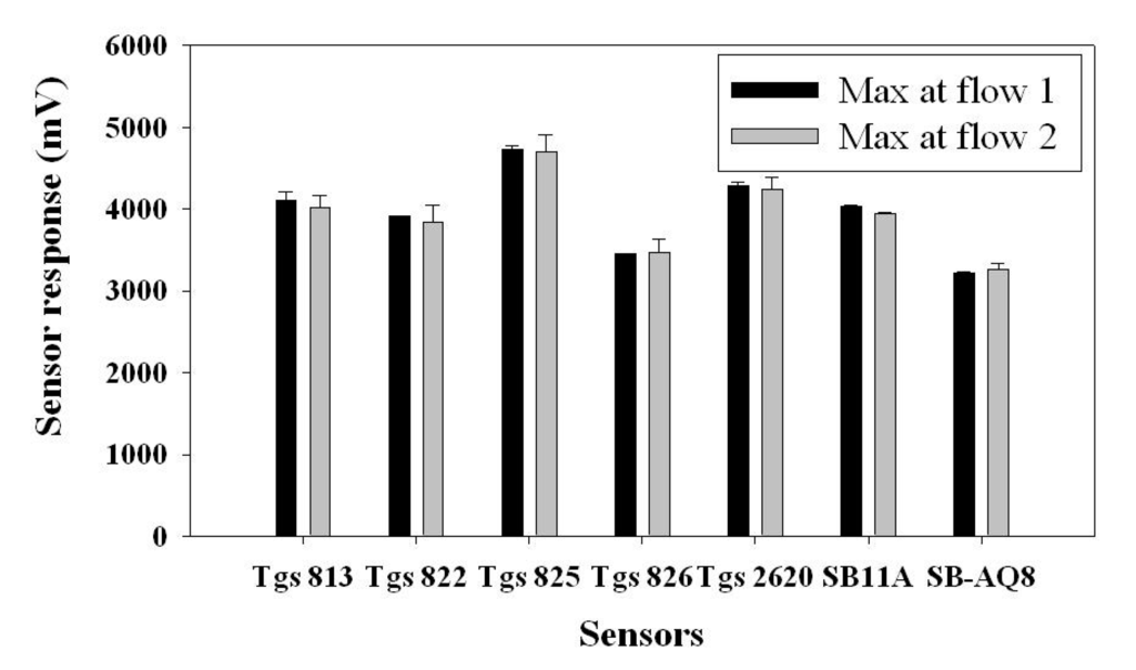 The same procedure was followed as in previous tests, but the sample was drawn in two different directions represented as “Flow 1” and “Flow 2”. Flow 1 represented the sample flow where the entry point was close to TGS 813 and TGS 825 was the exit point. Flow 2 represented the sample flow where the entry point was TGS 825 and the exit point was close to TGS 813 (Figure 11). The t-test was performed on all the seven sensors in terms of their maximum responses to two flow directions using SAS V9 (SAS, Cary, NC, USA) (Figure 12). Almost all sensors (except SB 11A) showed no significant difference in two flow directions. In other words, a majority of sensors were not sensitive to the position in the gas sensor chamber. In particular, the two sensors located at the entry and exit positions were not affected by the flow direction.