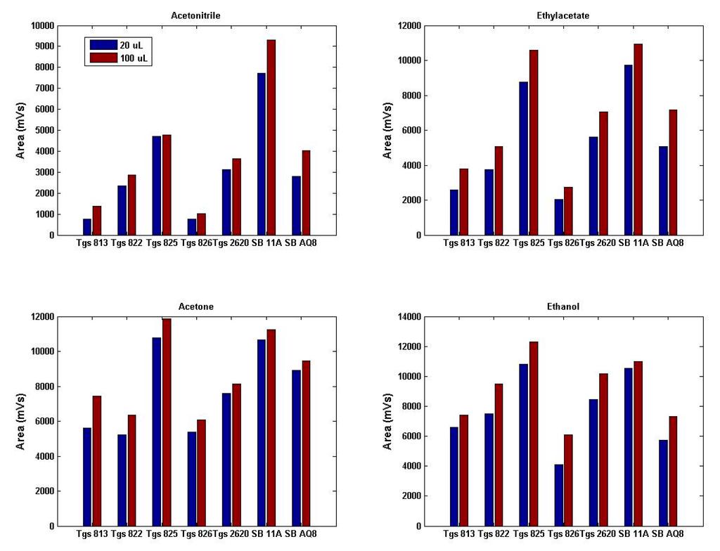 The operation and sensitivity of the device was tested by exposing it to four chemicals, acetone (ketone, a colorless, flammable organic compound), ethyl acetate (ester, a sweet smelling, colorless organic compound), acetonitrile (nitrile, a simpler form of colorless nitrile), and ethanol (alcohol, a flammable, colorless volatile liquid).