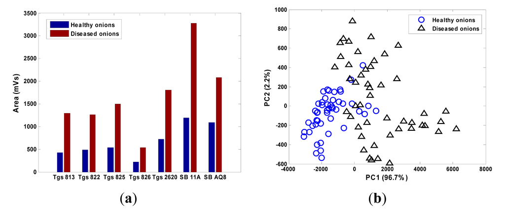 The raw data from all the MOS sensors were corrected using the differential baseline correction method and the feature was extracted by calculating the area under the section of the sensor response when the device was exposed to the sample odor. The smellprint was obtained by collectively considering the responses from the seven MOS sensors (Figure 15a). The magnitudes of the sensor responses to diseased onions were more than twice of those to healthy onions. The principal component analysis (PCA) score plot showed that the healthy and diseased onions can be largely separated by the first two principal components (Figure 15b).