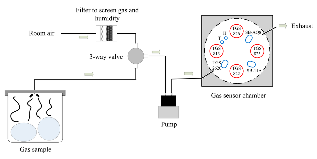 Compared to the analytical chemical methods such as GC/MS, the electronic nose (E-nose) technology offers an alternative approach for volatile compounds detection in a rapid and non-destructive way [4,5]. The idea of the E-nose was first proposed by researchers from Warwick University in early 1980s [6]. The proof of concept was presented to use three metal oxide (MOS) gas sensors to identify odors. Since then, there has been a large body of literature in developing and applying the E-nose technology in various fields, such as food and beverage [7,8], environmental monitoring [9,10], and disease diagnosis [11,12]. Major types of gas sensors include MOS, conducting polymer, surface or bulk acoustic wave (SAW or BAW) sensors, and metal oxide field effect transistors (MOSFET). The metal oxide semiconductor (MOS) gas sensors invented by Taguchi in 1960s are one of the earliest commercially available gas sensors with more than 70 types and are perhaps the most widely used gas sensors in the field of E-nose [13]. The MOS sensors are operated at high temperature (50 °C–400 °C) and therefore are insensitive to humidity. Commercial E-noses using MOS sensors include FOX 2000–4000 (Alpha MOS, Toulouse, France), PEN 3 (Airsense Analytics, Schwerin, Germany), and MOSE II (GSG Mess-und Analysengeräte, Bruchsal, Germany). The conducting polymer gas sensor is another widely used and commercially available gas sensor. Similar to the MOS gas sensor, the conducting polymer gas sensor also identifies odors by detecting sensor resistance change, although its operating mechanisms are more complex [13]. One main advantage of using conducting polymer sensors is that they can be operated in ambient room temperature. However, they have relatively slow response, sensitive to water vapor, and tend to drift over time. Commercial E-noses using conducting polymer sensors include Cyranose 320 (Sensigent, Baldwin Park, CA, USA), and Aromascan A32S (Aromascan, Osmetech Inc., Wobum, MA, USA). A surface or bulk acoustic wave (SAW or BAW) sensor detects volatiles compounds by sensing the mass change based on a piezoelectric effect. The zNose 7100 (Electronic Sensor Technology, Newbury Park, CA, USA) is based one SAW sensor. Although there are new technologies such as optical gas sensor [14], they are complementary approaches that enhance the performance of the E-nose [5].