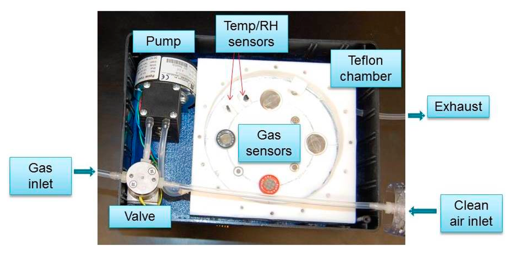 Gas samples were drawn inside the chamber using a pump (NMP 830 KNDC B BLDC motor, KNF Neuberger, INC, Trenton, NJ, USA), and a 3-way valve (225T031, NResearch Incorporated, West Caldwell, NJ, USA) to select one of two pneumatic circuits. One was provided with a filter containing charcoal and desiccant (removes humidity and unwanted odor in the air) to deliver fresh air to clean the chamber. The other air flow path was used to deliver the gas samples of interest to the sensor chamber. Teflon tubing (Outer diameter = 4.76 mm) was used to deliver the gas to the chamber. The schematic diagram and the picture of the mechanical design are provided in Figures 2 and 3, respectively.