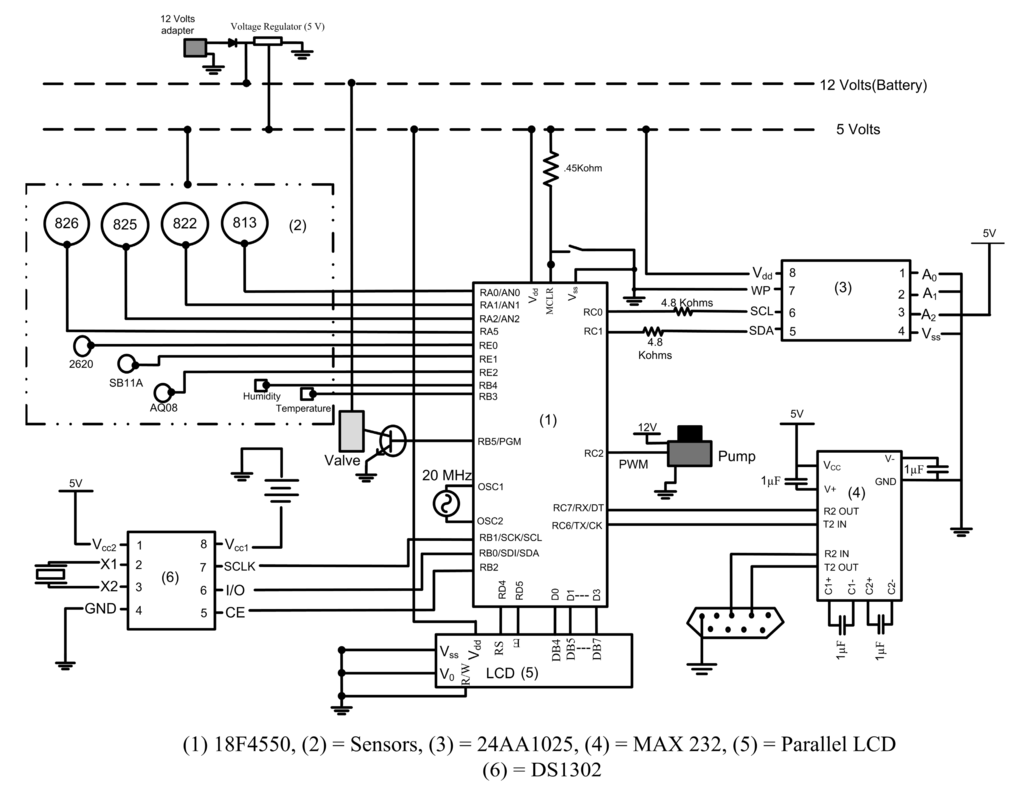 Additional components were needed to perform various tasks. A 3 V DS1302 trickle-charge real time clock chip (Maxim Integrated, San Jose, CA, USA) was used to obtain time information. A RS-232 interface (MAX232IN, Texas Instruments, Dallas, TX, USA) was used to serially communicate with the PC and transfer data from the device to the PC. A parallel LCD was used to display the status of the device.