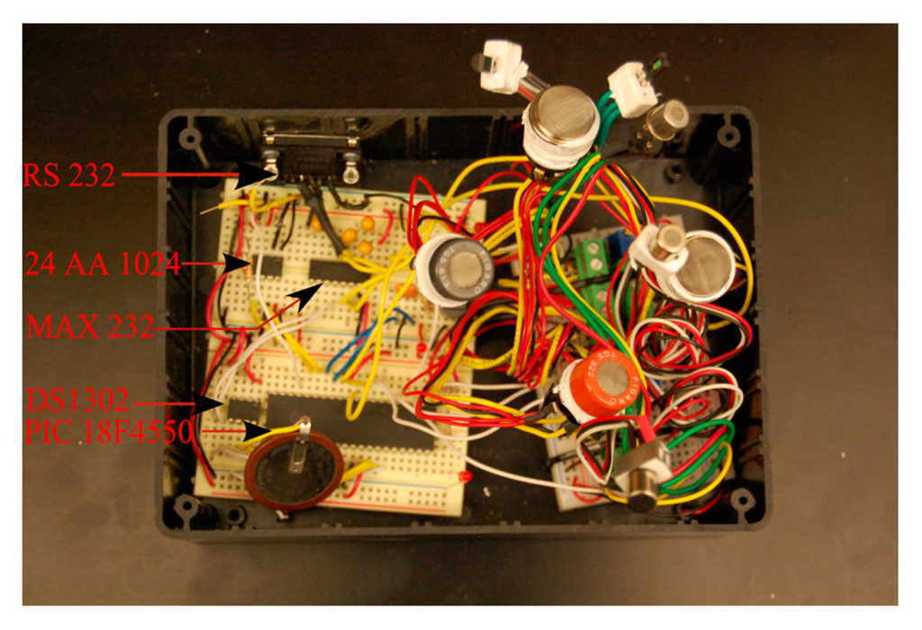 The electronic circuit performs the sensing of the volatiles, data acquisition (analog to digital conversion), onboard computation (feature extraction from the sensor responses), and data storage. The electronic components and their functions are explained in detail below.