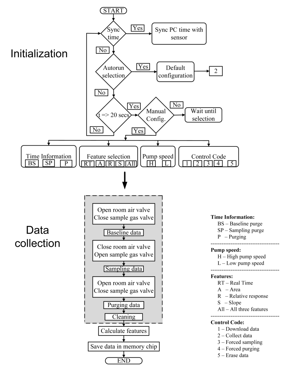 The device operated based on multiple user-provided instructions in the form of a string of numerical values. The MCU was coded to respond to each numerical value. The string contained 12 digits: 11 digits were allocated to input command information and the 12th digit for command type. The command enabled the user to select one of four options for feature extraction (1 = area under the curve, 2 = relative response, 3 = slope and 4 = all three features). Pump speed was selected from the two selections: “High speed” and “Low speed”. The duration of the three steps (baseline purge, sampling, and sensor purge) of a sampling procedure can also be determined by the user. These instructions were programmed into the LabVIEW software interface and were provided by clicking the corresponding buttons on the GUI software. The overall structure of the MCU program is illustrated in Figure 6.