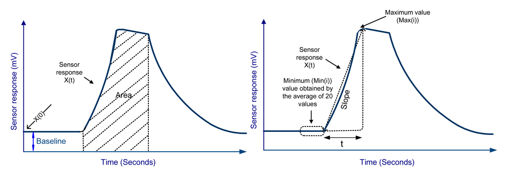 The device measured the volatile profile of the sample gas under investigation. It was programmed to collect not only the sensors' responses with a 15 Hz sampling frequency, but also maximum value, minimum value, and time taken to reach the maximum value (Figure 7). This information was used to calculate the three different sensor response features; area under the curve, slope and relative response. The feature calculation is discussed below in detail.