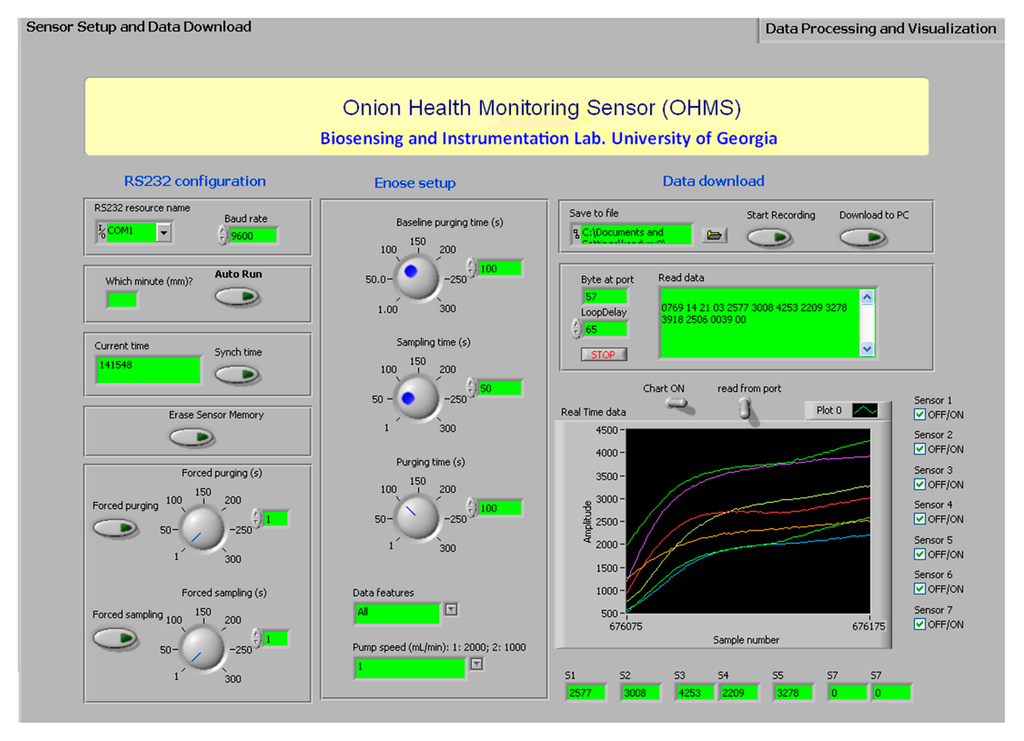 The development of a customized E-nose requires a combination of volatile sampling, volatile sensing, electronic control, data recording, and data analysis. There have been several documented efforts to develop a customized E-nose in the laboratory. For instance, a group used MOS (metal oxide semiconductor) sensors and a data acquisition card (USB 6008) to record sensor responses to classify the change in Thai herbs of northern Thailand [23]. E-nose prototypes were fabricated to classify beverages [24] and to perform spoilage classification of beef [25]. A MOS-based gas sensor array was customized for discriminating coffee aromas, essential oils and volatile compounds with different functional groups [26]. Also, based on the concentration of air contaminants such as NO2 and CO, indoor air quality was monitored with a customized E-nose [27]. However, these prototypes either do not have on-board computation capabilities or do not have sample delivery system (such as pump and valve). In addition, they are not specific to onion post-harvest disease detection. To fill this gap, a customized gas sensor array was developed, which consists of multiple MOS gas sensors, a gas delivery mechanical system, an automated electronic circuit board, and user friendly software. Due to its low cost, multiple such devices could be deployed in a large onion storage room. The device and the methodology employed in this project could potentially be modified to match the requirements needed for detecting post-harvest diseases in other specialty crops.