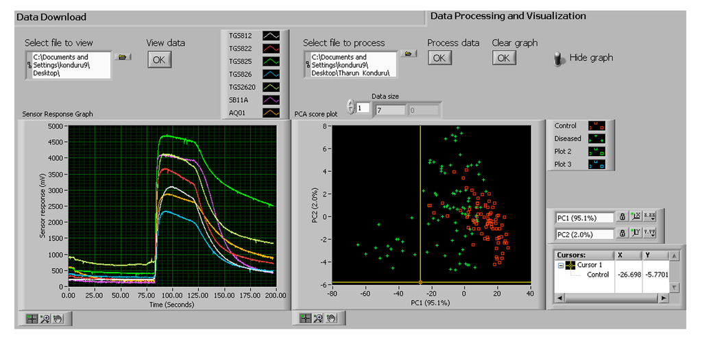 The real time data (in the txt format) can be displayed and analyzed in the “Data processing and visualization tab” (Figure 9). Figure 9 shows the baseline, sampling and the purging phases in the left window. The generated graph was used by the user for quick observation of sensor responses. On the right side of Figure 9, principal component analysis (PCA) was conducted by specifying the path of the file in the “Select file to process” box and clicking “Process data” option. The PCA score plot was used for quick evaluation and diagnosis of the objects being investigated.