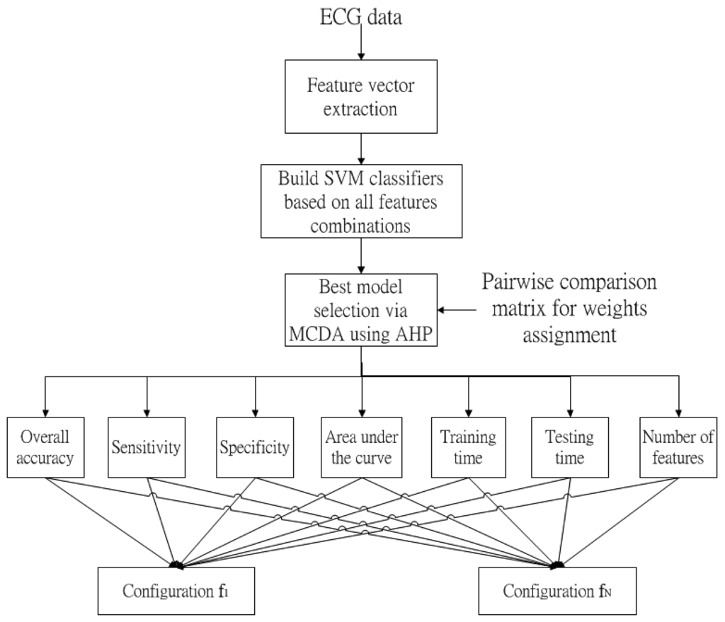 Figure 1 summarizes the block diagram of the new method. After the retrieval of ECG data, feature vectors are extracted. The SVM classifiers are then designed based on the features combinations. Therefore, N configurations can be obtained. The best model is selected among configuration f1 to configuration fN based on seven criteria, namely overall accuracy, sensitivity, specificity, area under the curve, training time, testing time, and number of features, with the aid of MCDA via AHP. The details of the new method are illustrated in the following.