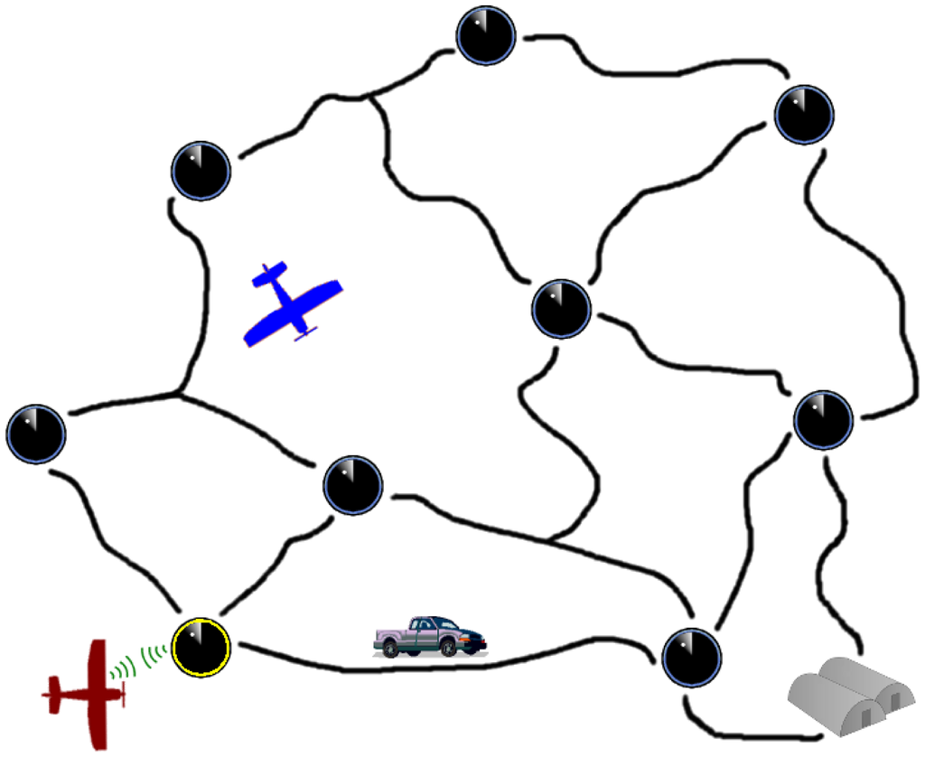 To maximize the coverage of the road network, the UGSs are placed far apart. The UGSs possess short-range communication devices, but have limited long-range communication capabilities; they require a line of sight to a dedicated communication device with a permanent power source. Placing communication devices to meet these requirements can be difficult depending on the terrain and conditions (e.g., contested environment). However, this problem can be circumvented by using mobile UAVs instead of immobile communication devices. The UAVs do not require the difficult placement of communication devices and power sources in the area, such that the line of sight is maintained between devices; instead, they act as mobile communication devices by querying UGSs directly below using a short-range communication device. Thus, it is assumed that the UGSs cannot communicate with one another, but only with UAVs directly overhead. In contrast, the UAVs are capable of communicating between one another and a central authority (e.g., the base) via a low bandwidth, long-range communication link. The low bandwidth link allows for the transmission of small amounts of information, such as UGS detections or waypoints, but prohibits the transmission of large datasets, such as images. The link is assumed to cover the entire operating area. The short-range and long-range communication devices are assumed to transmit in the electromagnetic spectrum, and as such, communication times are small compared to the other time constants involved in the problem.