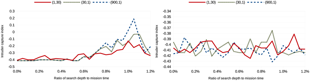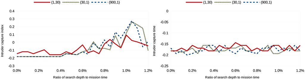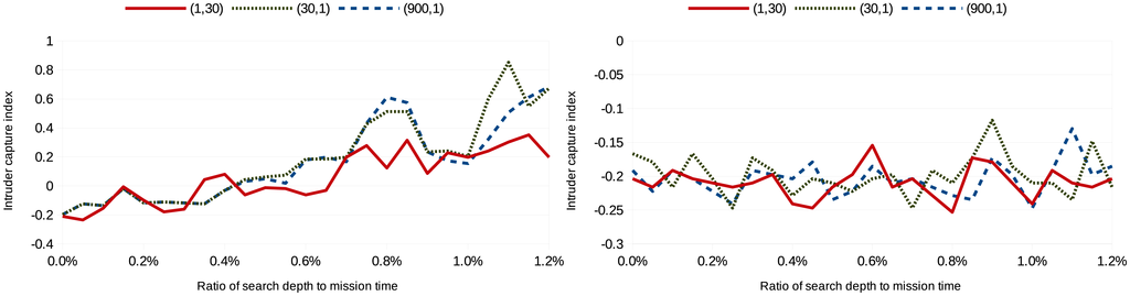 In the left subfigures of Figures 3, 4, 5 and 6, where uavsAction() is used, the intruder capture index increases as a function of search depth for all cost functions. The intruder capture index for localSearch() (right subfigures of Figures 3, 4, 5 and 6) does not increase significantly with a larger search depth. While uavsAction() and localSearch() perform similarly for short search depths, uavsAction() performs better than localSearch() for larger search depths.