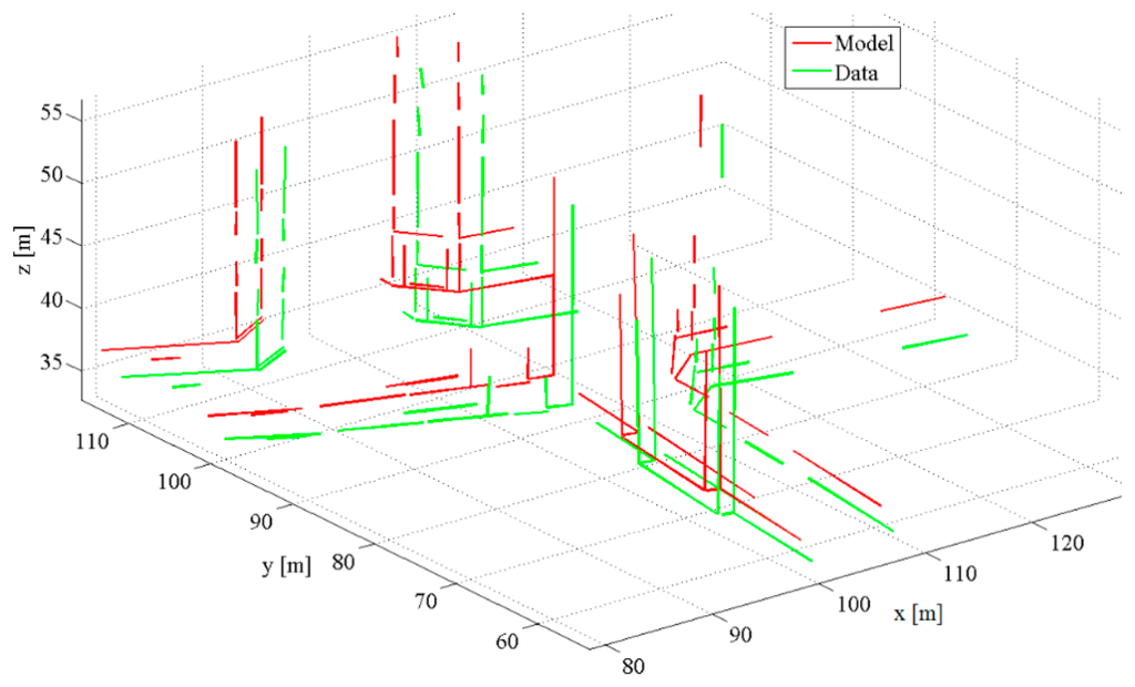 The synthetic data consists of two datasets, each of which contains 64 linear features (Figure 10). The Data set is obtained by transforming the Model set using a rigid motion, setting the rotation (R) as Euler angles (1.0°; −1.0°; 1.0°) and the translation (T) to (−1.0 m; 0.5 m; 1.0 m).