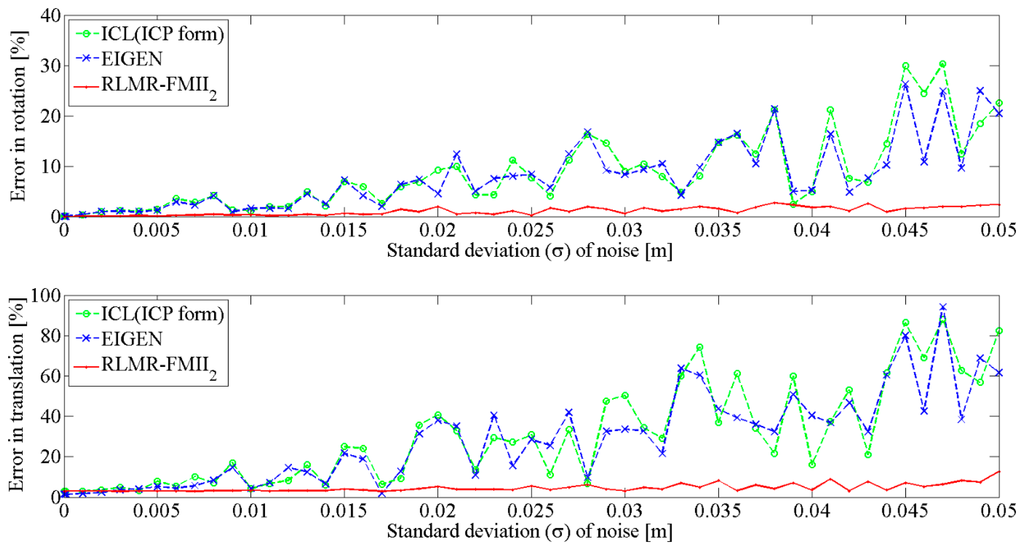 In contrast, the RLMR procedure gives much smaller errors than EIGEN and ICL (ICP form) methods. The results are accurate, despite the presence of an extra factor affecting the quality of the estimate, namely the matching process, which may generate some erroneous line pairings. The error in rotation eR is stable regardless of the noise level. In fact, its value is less than 0.5% for σ ≤ 0.015 m, else it ranges from 0.5% to 2.8%. Finally, the error in translation eT is greater than eR and remains within the interval of 2.9% to 12.7%.