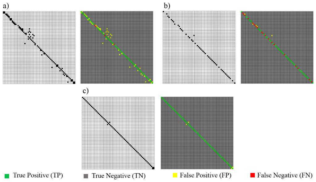 Afterwards, a confusion matrix (an error matrix) is created to visualize the number of pairs which are: (1) correctly matched (True Positive); (2) incorrectly identified (False Positive); (3) correctly rejected (True Negative); (4) wrongly rejected (False Negative), during both the approximate matching Aini and the explicit matching Af. A sample result for line segments artificially corrupted by noise with σ = 0.04 m is illustrated in Figure 13.