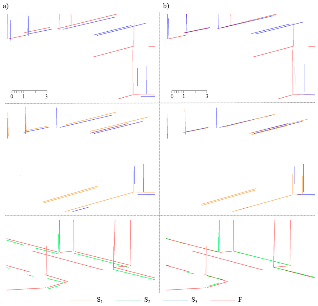 To investigate the quality of the estimated transformation parameters, the registration results for a small fragment of the aligned line sets are presented in Figure 14, with different colors indicating different datasets.