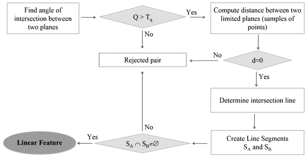 Linear features reconstructed from 3D point clouds may be divided into two types [10]: (1) crease edges corresponding to discontinuities in the first derivative or equivalently in the surface normal direction, which can be found from plane-plane intersections; (2) jump edges related to discontinuities of the surface.