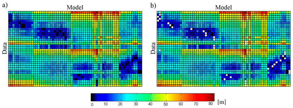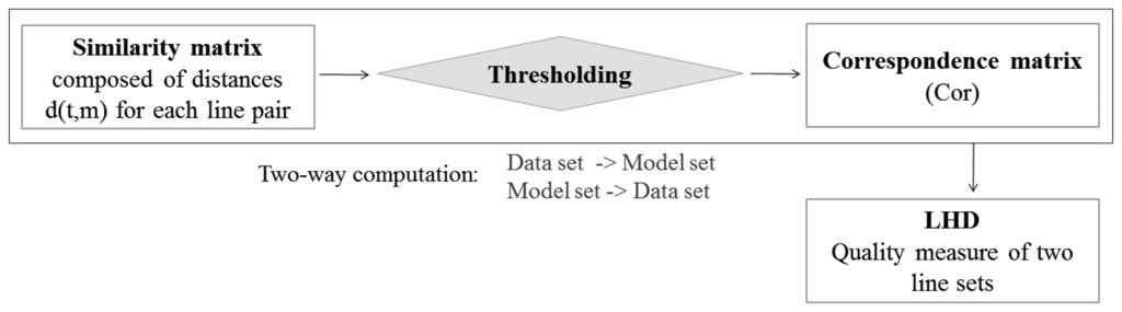 The determination of correspondences is typically a challenging aspect of the overall registration process, which directly affects the quality of the estimated transformation parameters and has the potential to cause divergence of the optimization algorithm. To explain the conceptual basis of our correspondence-finding procedure, suppose the set Data = {t1,t2,…,ti,…,tp} need to be transformed so as to obtain the best alignment with the other set Model = {m1,m2,…,mj,…,mq}. Formally, a set is denoted by an uppercase letter and an individual element by a lowercase letter. The identification of conjugate lines involves assigning a dissimilarity measure d(t,m) based on geometric characteristics such as magnitude, orientation and location. This individual score, calculated for the total number of line pair combinations, is used to build a similarity matrix. Afterwards, the same line segments should be identified by analyzing the elements of this matrix. Here “same” means that they have small d(t,m) values (within a predefined threshold). This threshold is fixed and depends on the noise level, the spacing between the two sets, and the accuracy of the line extraction algorithm. All the chosen line pairs to create a binary correspondence matrix are put together. Its indices denote the features, which are most likely to correspond amongst the two input linear feature sets. The three main stages of this method: the similarity matrix, the correspondence matrix formed by thresholding, and the similarity measure Line Hausdorff Distance (LHD) [23] used as a quality indicator, which evaluates the coincidence of conjugate features following the registration procedure, are presented in Figure 3. At all times, the pairing is made bilaterally: the Data set is compared to the Model set and vice-versa. This solution is directed by the conditions imposed by the definition of the Hausdorff metric. This will be further explained in Section 2.2.3.