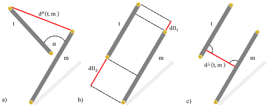 The angular deviation dα(t,m) and the two spatial displacements in the form of an overlapping indicator dII(t,m) and a perpendicular distance d⊥(t,m) are considered to measure the similarity d(t,m) between any two line segments. The constant W is a non-dimensional weight for angle distance, chosen empirically as 10. Its purpose is to provide a better tolerance to potential misalignments of lines since dα(t,m) closes to zero for parallel lines, will much more contribute to the overall value of d(t,m) in case of lack of parallelism. Therefore, the score d(t,m) may be interpreted as a minimum displacement required to superimpose any pair of segments (e.g., t and m). All types of distance defined to measure the dissimilarity between 3D line pairs are shown in Figure 4.