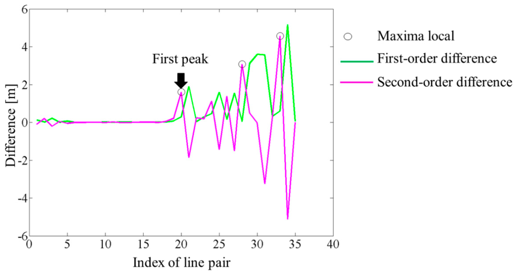 First, the differences between adjacent elements of the sequence S sorted in ascending order are calculated. This aims to create a new list of values known as the first-order difference Diff1 (green plot in Figure 6). The operation is carried out again, but this time on sequence Diff1. The result, the second-order difference (Diff2), is illustrated in Figure 6 (magenta plot). Next, a search for relative extrema in the input data set is used to discriminate all local maximum values in Diff2. Assuming an a priori sensibility U (minimum peak height) for the search function, the first detected peak (pks) denotes the index of the line segment pair whose score will correspond to the chosen threshold value (δ).