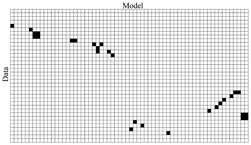Using this threshold δ a correspondence binary matrix Cor between the finite indexed sets Data and Model (see Figure 7) is created as: