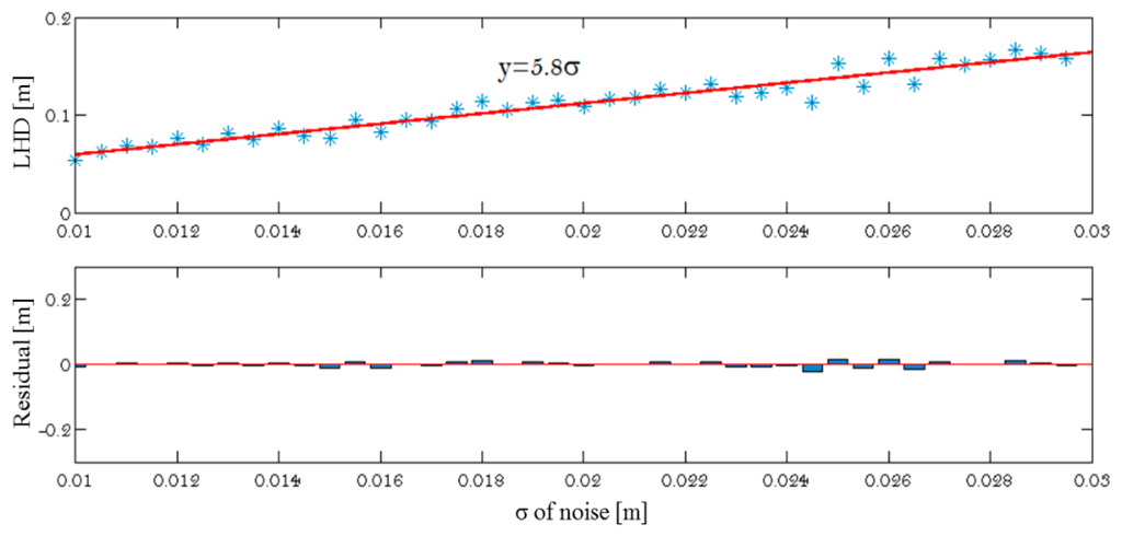 In other words, the best sample is the one for which the number of line pairs from Aini—which after registration possess a score d(t,m) within the given tolerance γ–is the greatest. This threshold γ is set as a function of the predicted standard deviation (σ) for Gaussian noise affecting the localization of extracted line segments. The impact of noise levels on the distance has been tested by analyzing the LHD value between two datasets, the first one containing noise-free 3D line segments, the other containing the same elements corrupted by noise. Specifically, Gaussian noise with mean zero and standard deviation σ is added to the coordinates of each line segment endpoint. The relationships between the noise level and the computed distance are shown in Figure 9. The σ is directly linearly proportional to OLHD (OLHD ∝ σ) as: